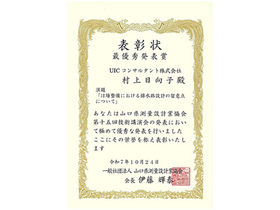 2025/10/30 第15回技術講演会で山口県測量設計業協会より最優秀発表賞を受賞しました。
