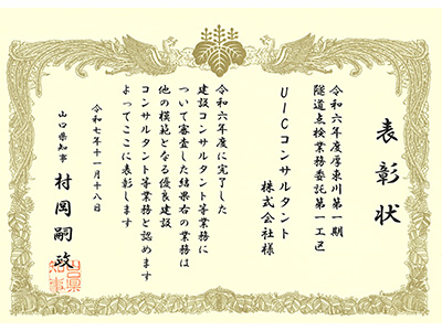 山口県より、「令和6年度厚東川第1期隧道点検業務委託第1工区」において、優良業務および優秀技術者として表彰を受けました。TVカメラロボットの活用や無線LANによるトンネル内外の連絡体制の構築により、水路トンネル点検における安全性の向上、作業効率の改善、点検記録・管理の効率化に向けた取り組みが評価されました。今後も山口県の社会資本整備に貢献すべく、技術の研鑽と品質のさらなる向上に努め、安全で安心な社会基盤の構築に寄与してまいります。