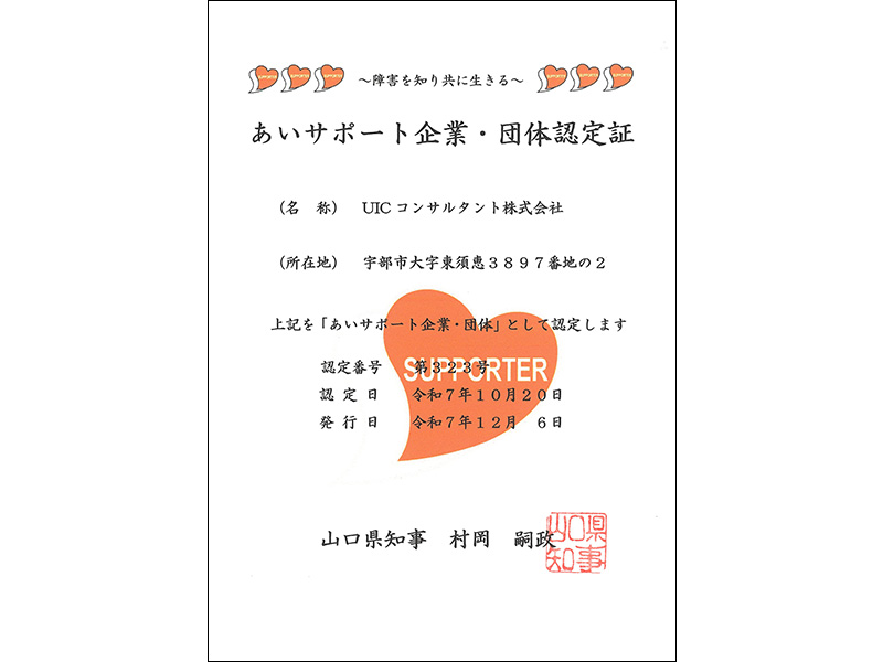 この度、弊社は「あいサポート企業・団体」として認定されました。「あいサポート企業・団体」とは、あいサポート運動の普及等に積極的に取り組む団体として認められたものです。12月6日(土)に開催された第31回山口県障害者芸術文化祭の表彰式後、「あいサポート企業・団体認定証授与式」が行われ、村岡知事より認定証を授与していただきました。